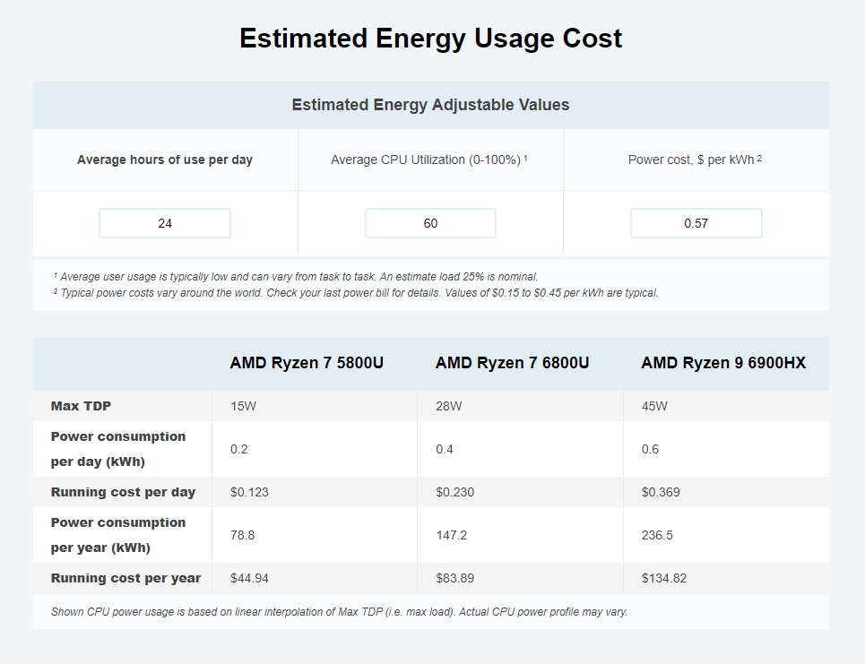Tramite il sito cpubenchmark è possibile stimare, modificando ovviamente i parametri d'uso e il costo della corrente (comprendendo quindi il trasporto e l'attuale tassazione) il consumo energetico annuale del processore a cui successivamente andranno aggiunti i consumi di ciascun componente.